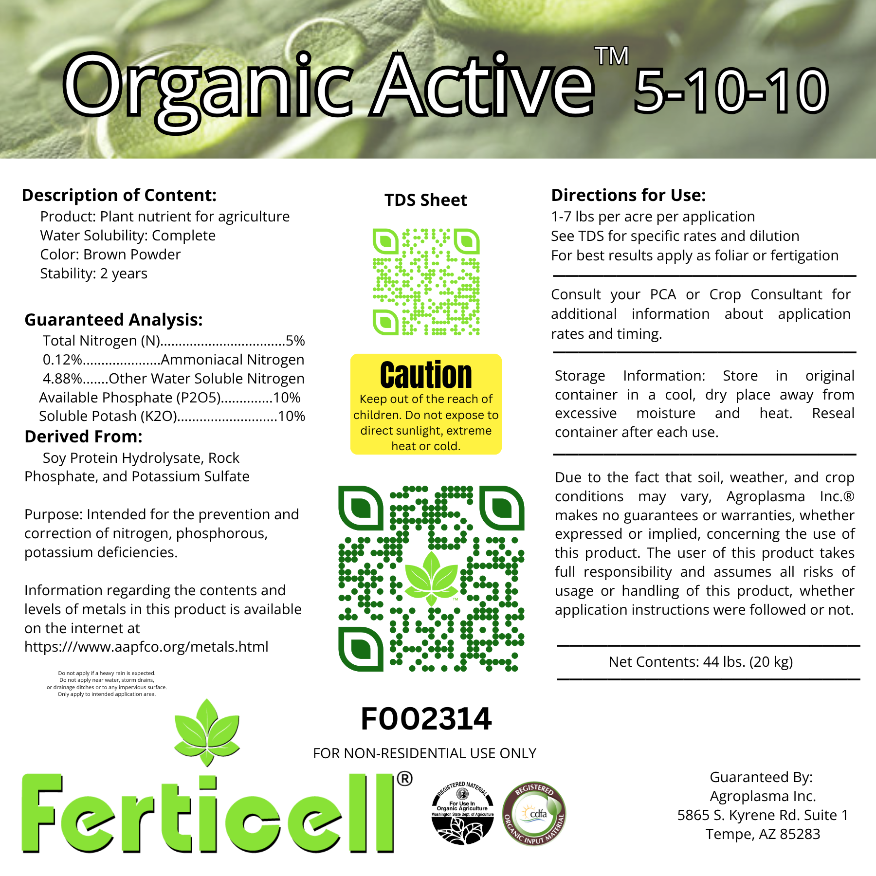 Active™ 5-10-10 is a perfect balance of organic NPK that delivers a blend of all three macronutrients in a grower friendly, dry powder fertilizer throughout the season. With additional phosphorus and potassium, they are accelerated in nutrient use efficiency by the 5% nitrogen that is provided by soy protein. There are four certified organic NPK fertilizers in this line. Foliar applications of the Active™ 5-10-10 can boost energy during vegetative and can help any crop finish strong during flower/fruiting through this balanced NPK fertilizer.